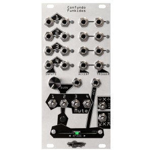 Confundo Funkidos es una utilidad de crossfader y mute de ritmos. Conecta dos pares de ritmos a las entradas izquierda y derecha y utiliza el crossfader controlable por CV y los tres algoritmos Curve para fundirlos y combinarlos de distintas formas. Cada canal tiene un conmutador de silencio que se puede utilizar para introducir y sacar una voz de un patch a voluntad. Toca el botón Burn para conseguir unos rellenos instantáneos, y tus interpretaciones de percusión nunca volverán a ser las mismas.