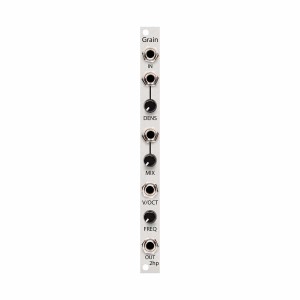 2hp Grain is a high fidelity audio processor focused on granular synthesis. It's capable of generating granular clouds, microsound phrases, and unique textures that are derived from any input signal. The Density control sets the rate of granularization applied to the input signal and sets its position within the buffer. The Mix control sets the balance between live input and the granular audio stream for dialing in the perfect combination of sounds. In addition, there is a frequency control and associated v/oct input allowing for pitch accurate sequencing of grains. Particle patching has never been smaller with Grain.