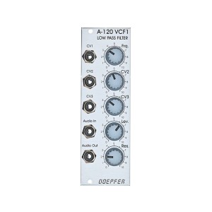 Module A-120 is a voltage controlled low-pass filter, which filters out the higher parts of the sound spectrum, and lets lower frequencies pass through. The Cut-Off Frequency determines the point at which filtering takes effect. You can control this manually, or by voltage control (filter modulation, for instance by an LFO). Three CV inputs are available, and the sum of the voltages from these affects the filter cut-off. The module is based on a so-called “transistor ladder” design, with a cut-off slope of -24 dB/octave, as in various Moog synthesizers. That’s what gives it its classic, legendary Moog sound. Resonance (or Emphasis) is adjustable all the way up to self-oscillation – in which case the filter behaves like a sine wave oscillator. Technical note: The module has been revised in 2009. The single transistors have been replaced by so-called transistor arrays which look like integrated circuits. But these are no “real” integrated circuits but contain nothing but 5 matched transistors. The new version of the module is still a transistor ladder based low pass filter !