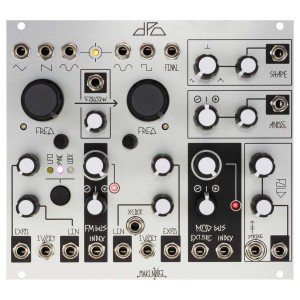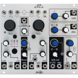 A dual Voltage Controlled Oscillator designed for generating complex waveforms. Expanding on the classic arrangement of Primary and Modulator Oscillators, the DPO has both of the VCOs operable as complex signal sources. It is in essence a Dual Primary Oscillator. – Vintage voiced, all analog – Triangle Core with Sine, Saw, Spike & Square wave shapes – Dedicated FM and Mod buses – Modulation source signals are internally routed with associated destination CV attenuators setting final depths – Mod Bus has added capability of using external source (patched at EXT. SouRCe input) in place of VCO 1 Sine – Bi-Directional Dynamic FM Bus allows for circular FM – VCO A features Hard Sync circuit which combined Dynamic FM yields complex sounds – VCO A operates as LFO, perfect for slow morphing of VCO B timbres – VCO B features complex timbral control through the use of a 3 parameter waveform shaping and Dynamic FM – Utilizes SIX Vactrols – Pairs well with the Echophon