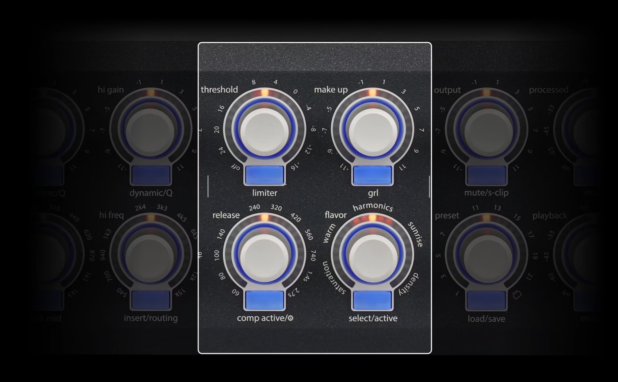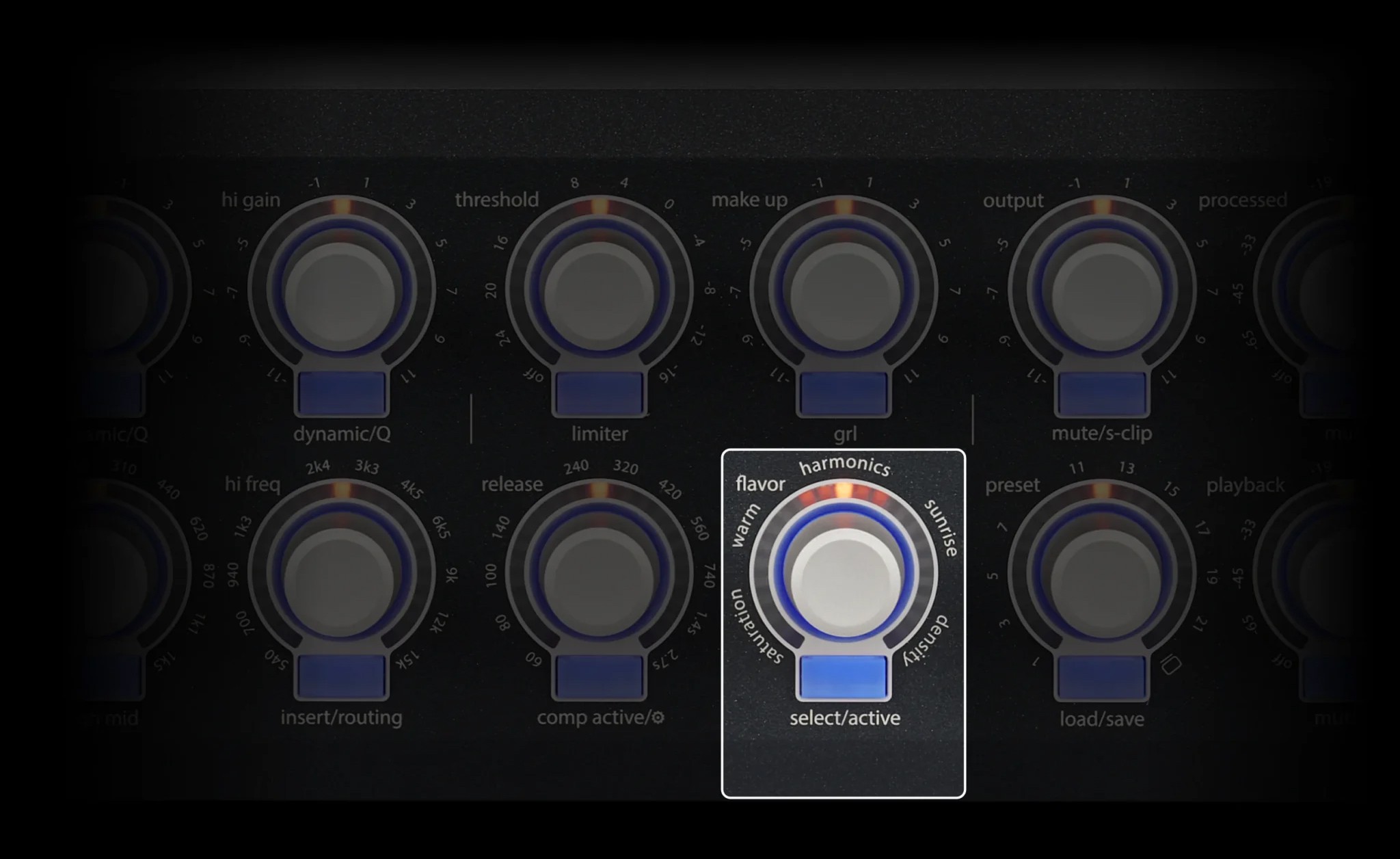 La sezione Flavor ti permette di scegliere tra 5 opzioni di colorazione, miscelarle e regolarne l’intensità. È pensata sia per ottenere un carattere caldo e “vintage”, sia per timbri moderni e presenti, con bypass immediato per confronti A/B.