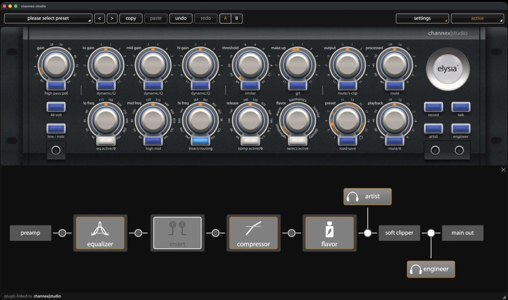 channex|studio permette di disporre le sezioni principali (EQ dinamico, compressione/limiter, insert, flavor) in ordine variabile, così puoi costruire sia catene tradizionali sia percorsi più sperimentali. L’insert hardware è ideale per integrare outboard esterno senza repatch continui, attivandolo o bypassandolo quando serve.