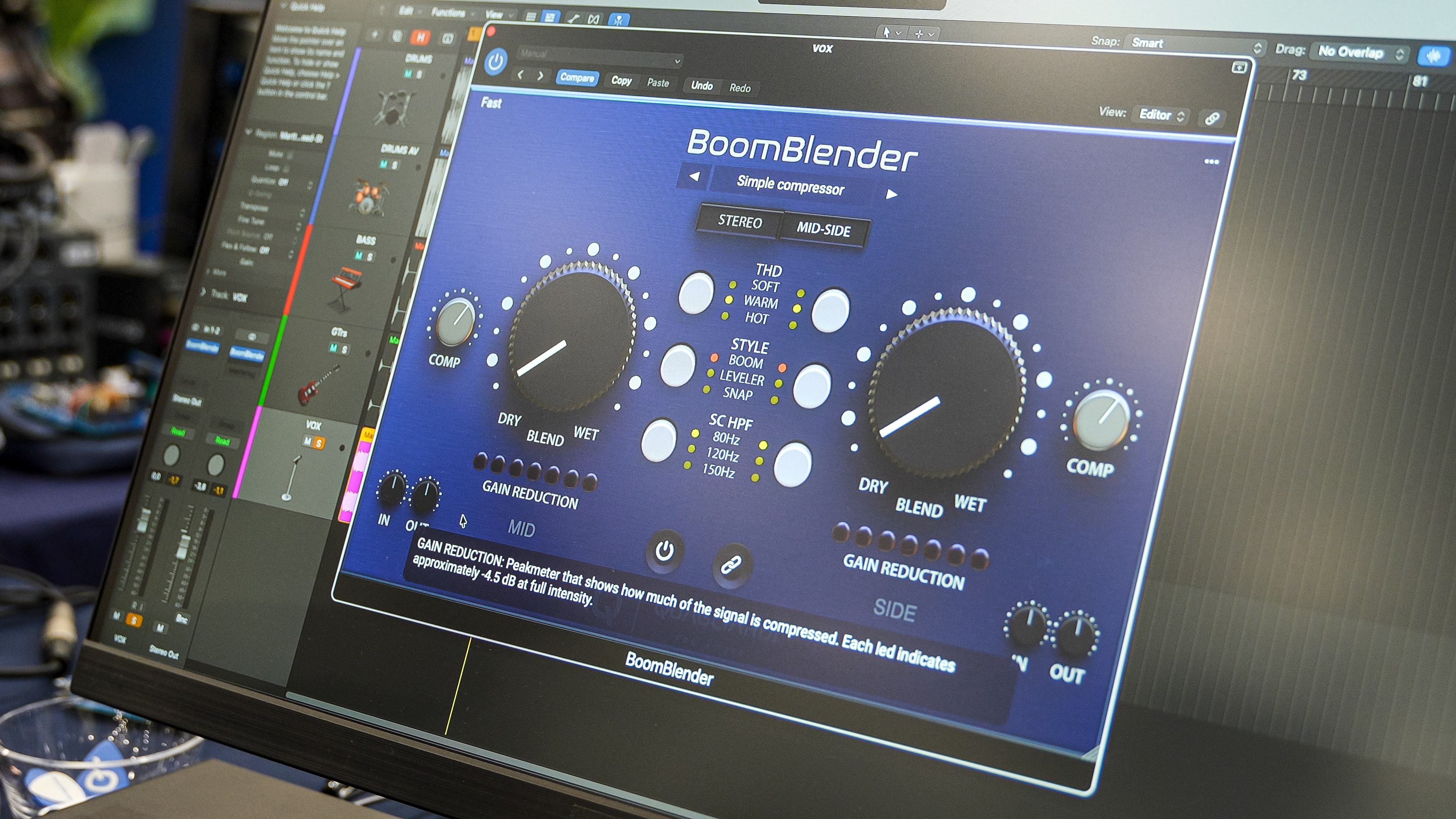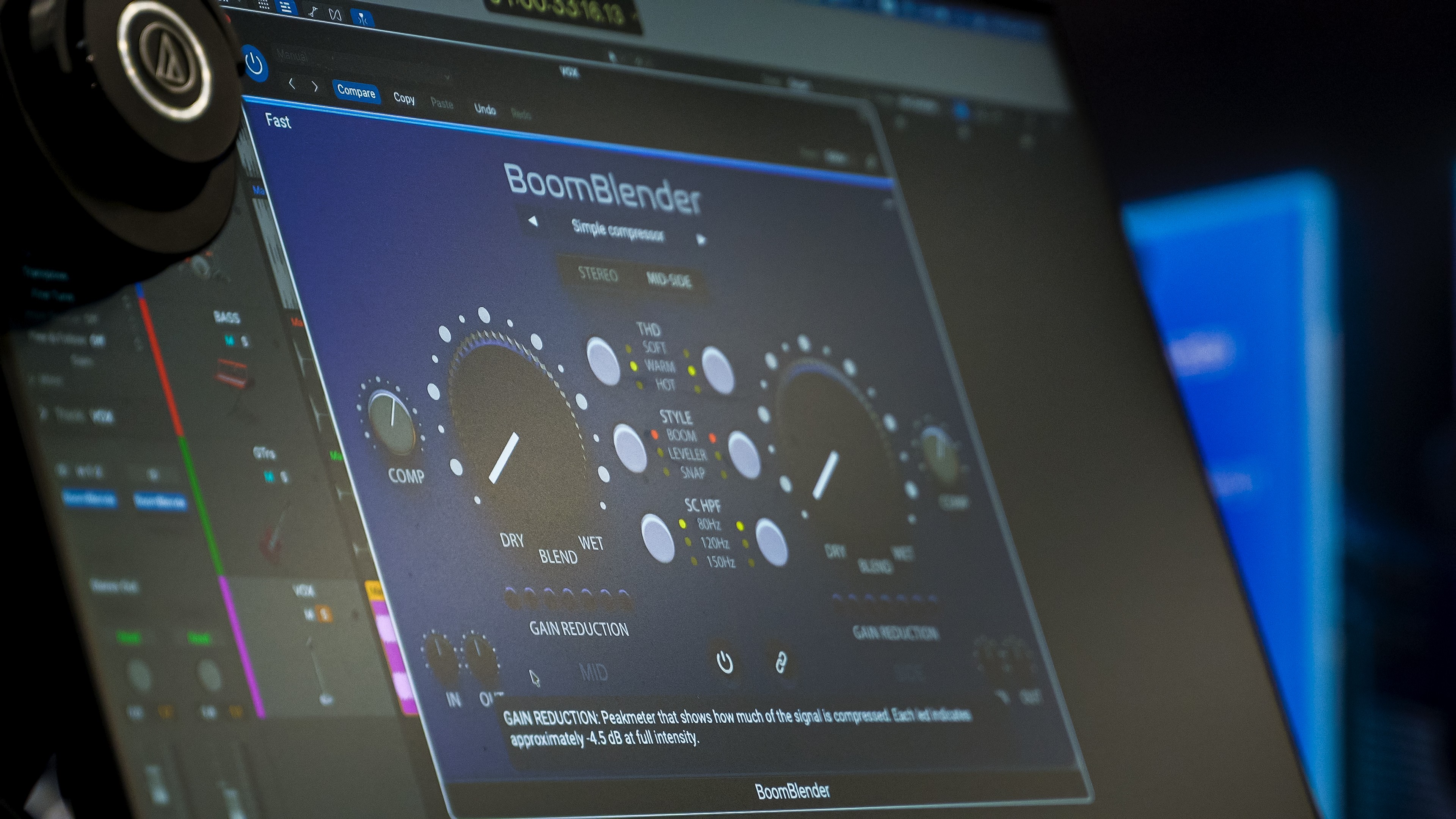 In the digital world, Quagliardi has launched BoomBlender, a plugin inspired by the famous "BOOM" mode of the Quagliardi 576 analog compressor. The "one knob" interface hides a powerful structure: compression, harmonic distortion, and even a Mid/Side module, for complete control over the spatiality of the track.